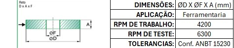 Tipo de rebolo, Dimensões, Aplicação, RPM de trabalho, RPM de teste e Tolerâncias Dimensionais (segundo desenho e/ou NORMA ABNT 15230).