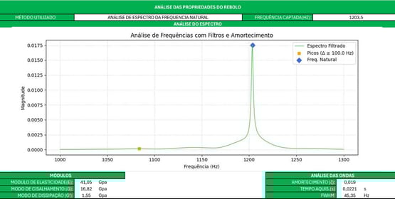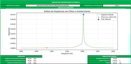 A análise é realizada através da análise do espectro da frequência natural. É um método de ensaio não destrutivo, utilizado para identificar o módulo de elasticidade (dureza) do rebolo, além de trazer diversas outras informações importantes como o módulo de cisalhamento, dissipação, amortecimento e largura da onda.